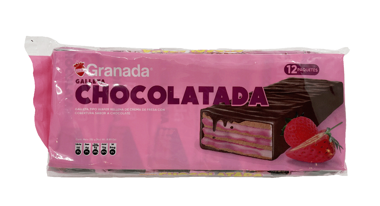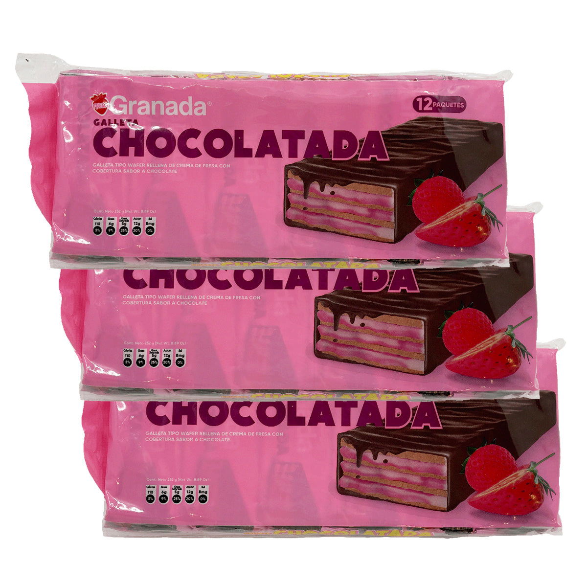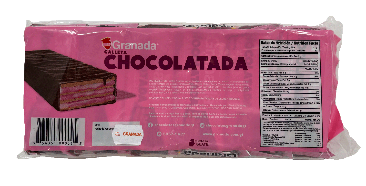 Add a fruity twist to your snack time with Granada's Chocolatada Strawberry Chocolate Waffle Cookies. With 12 in each bag, these cookies offer a delightful blend of strawberry flavor and rich chocolate. Enjoy these popular Latin American treats with a glass of milk or on their own.
