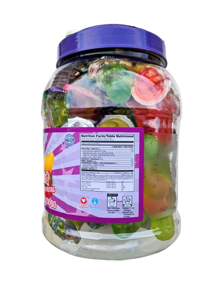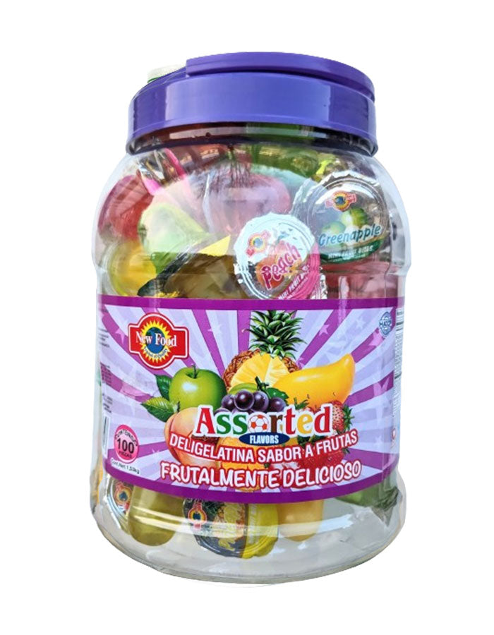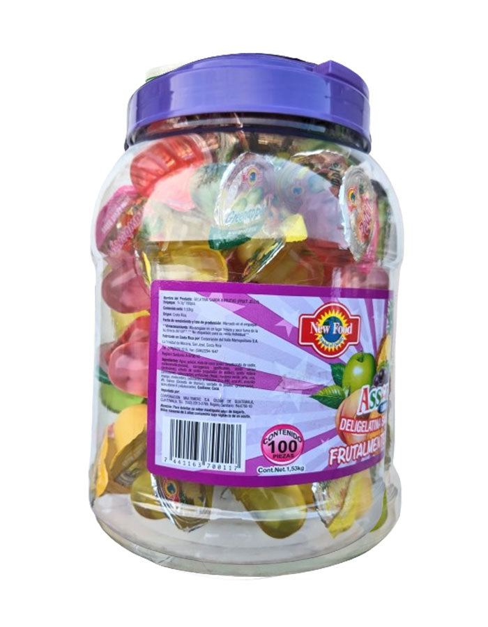 Bring home the taste of Latin America with New Foods' Mini Fruit Gels. Our container of 100 pieces is perfect for parties or large gatherings. Each piece is packed with natural fruit flavors, providing a sweet treat that everyone will love. Enjoy the delight of these popular jelly candies any time with New Foods.